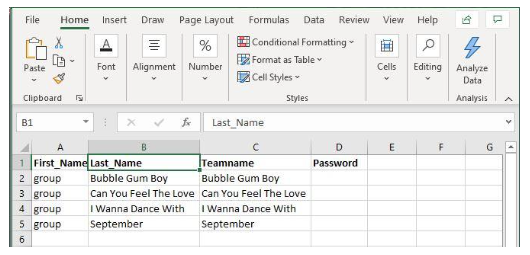 New Data File: Create a new .csv file containing the First Name (Group) Last Name (Group Name) and Teamname (Group Name)