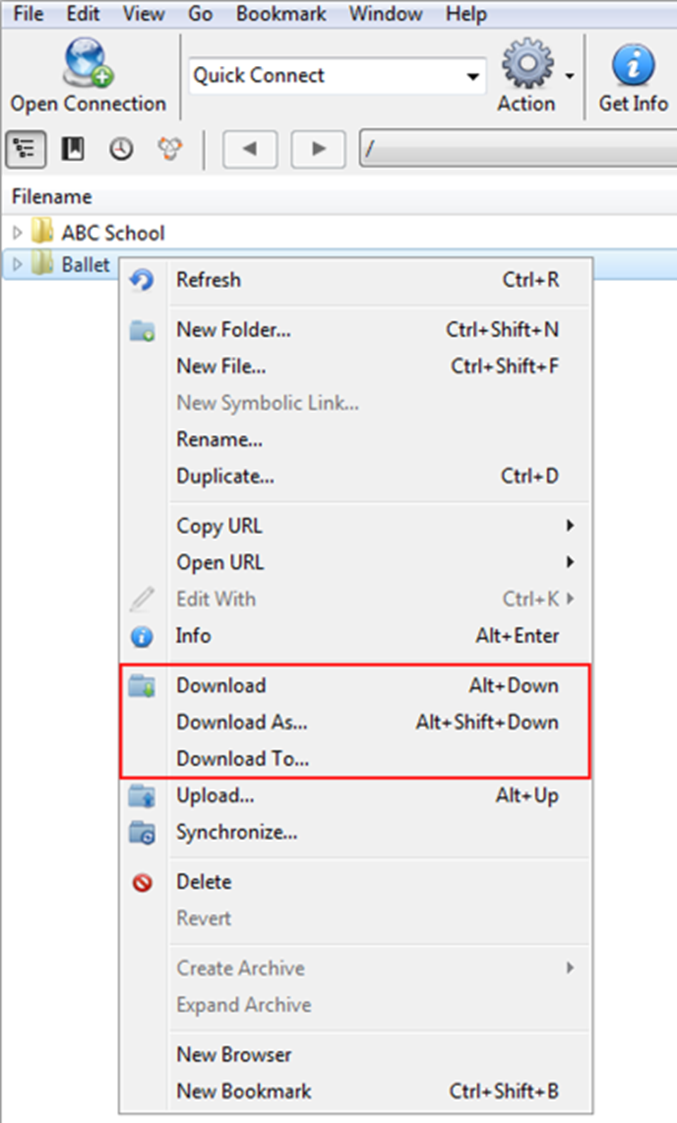 Once connected to FTP under the filename in the FTP window, right click on the folder you need to download and choose one of the three download options: Download, Download As…, or Download To…
