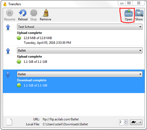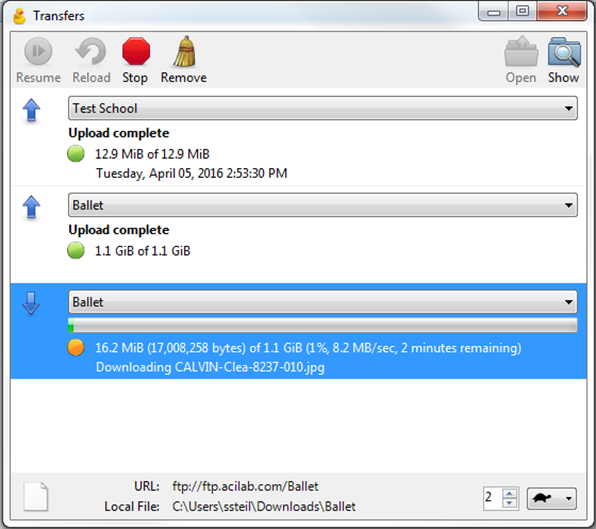 The Transfers Window will open and you will see the folder downloading. In the Transfer window on the left side you will see a Blue Arrow. Upward Arrow means Upload, Downward Arrow means Download.