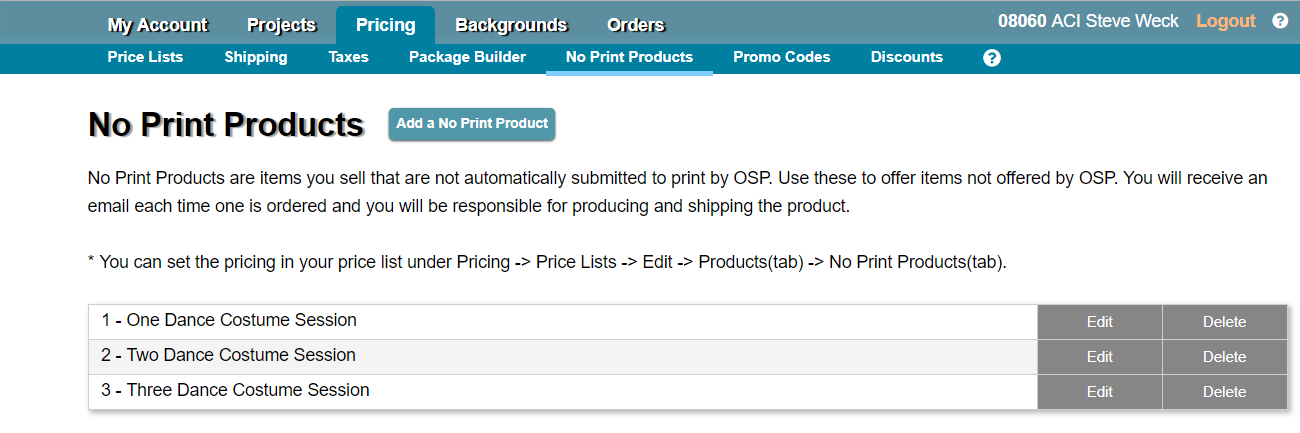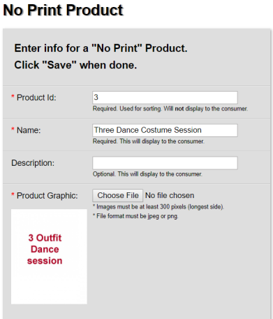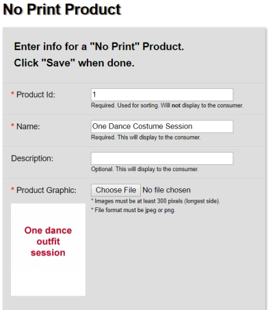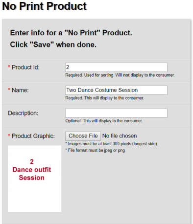 Next, create ‘session fee’ products using No Print Products for this. In this dance school example, a self-explanatory png file was created containing text, which is what the shopper will see.
