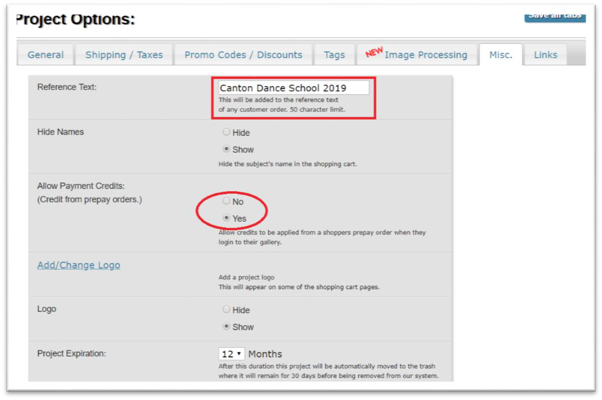 To enable ‘Allow Payment Credits’, from the Project Options screen, go to the Misc. tab within that project and select Yes for Allow Payment Credits